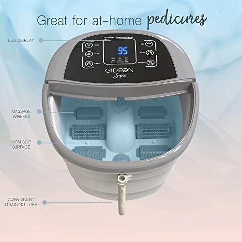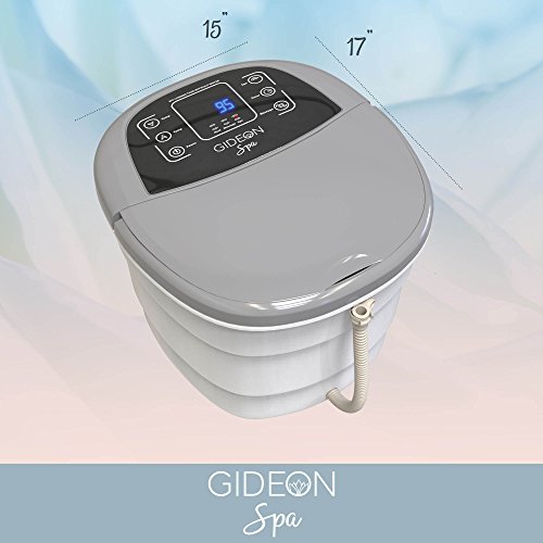 Studio : Gideon Publisher : Gideon Binding : Misc. Product Description Plunge your tired and achy feet after a hard day of work into the Gideon Foot Spa Bath Massager and enjoy the relaxing and soothing bubbling sensation, combined with a powerful multi-rolling foot massage. Helps relieve tired feet, soreness and foot aches. Get a spa like foot massage treatment in the comfort of your own home. Features four (4) bubbling water jets that completely envelopes your entire foot, toes, heals and ankles with oxygen rich bubbles. Enjoy the soothing relaxing sensation of bubbling warm water gently caressing your feet, combined with deep massaging action. Large size comfortably fits up to a Men's Size 16 and larger. Features a total of six deep-massaging rollers; two (2) motorized and an additional four (4) standard rollers. The two (2) motorized rolling massagers are designed with unique mini multi-rollers for an amazingly deep yet gentle massage experience. Amazingly relieves all foot aches and pains; reduces redness, swelling and soreness. Leaves your feet feeling extremely rejuvenated and refreshed. Features waterproof digital control buttons to allow to fully customize your foot spa session according to your precise needs. Set the duration of the spa session; choose from 10 minutes up to 1 hour. Control and maintain water temperature; select to power on/off the rolling massagers, and power on/off the bubbling water jets. Features 4 lockable rolling wheels, carrying handle and a convenient built-in water drain to help empty water after use. SPECIFICATIONS: Size: 15" x 17" x 11" Timer: 10 minutes - 1 hour Water temperature: 95F° to 118F° Water depth: 6 inches Voltage: 110v 0