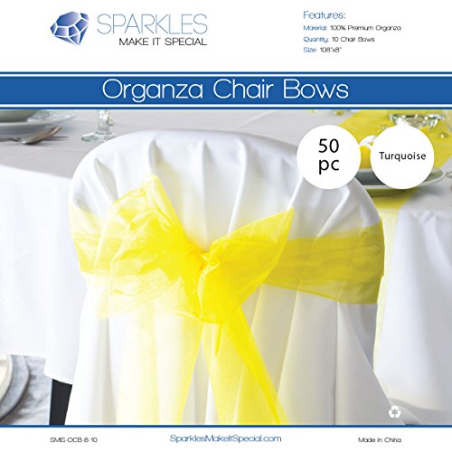 -. Feature : This is a 50 Pack of Brand-New Turquoise 108 inch by 8 inch premium organza chair cover bow sashes. / Brand-new premium organza chair sashes. Perfect for weddings, banquets, parties, receptions, or any place you wish to create an elegant look. / Easy to tie into a beautiful chair bow, drape across any decoration, or use as an attractive table runner. / 100% brand new, first run production. / Each chair bow arrives untied and carefully folded.