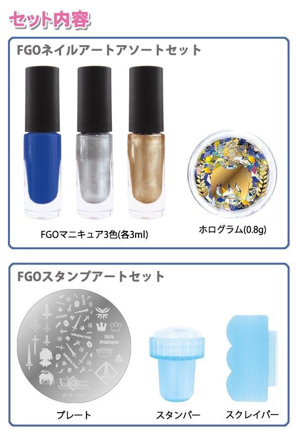 | セット内容 | 【FGOネイルアートアソートセット】 FGOマニキュア3色(各3ml)、ホログラム(0.8g) 【FGOスタンプアートセット】 プレート、スタンパー、スクレイパー |
