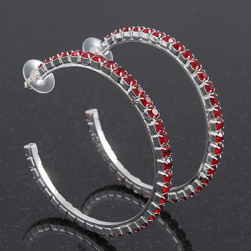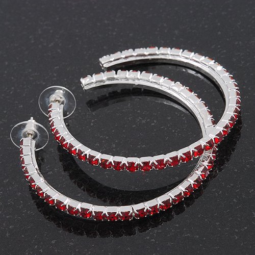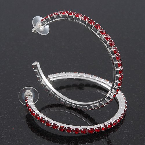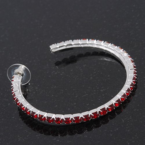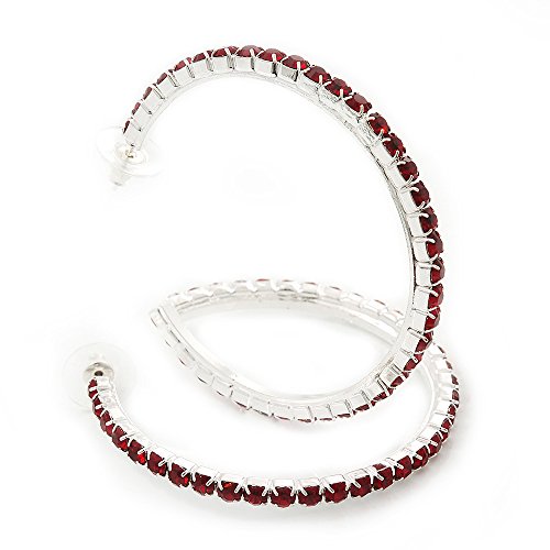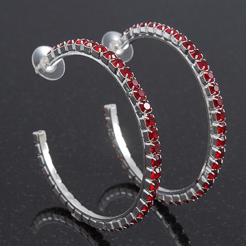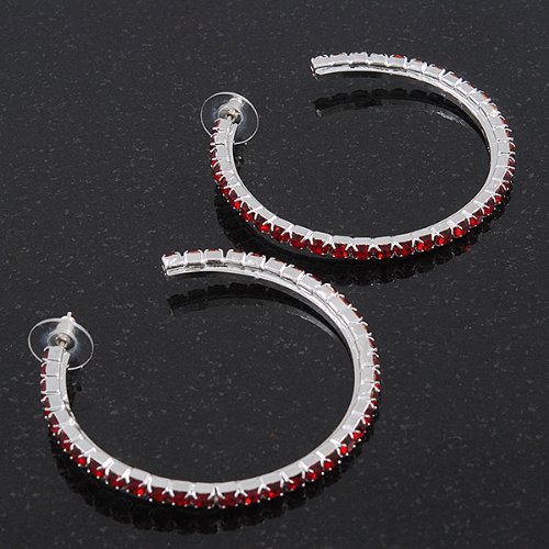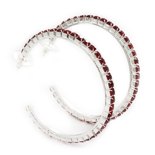 You'll get sparkling good looks from every angle with these classic hoops. All decked out in shimmering crystals, they provide a bit of beautiful bling for any outfit! Earrings crafted in polished rhodium plated metal and claw set with a row of burgundy red Austrian crystals. They measures about 6cm in diameter and 4mm in width. Secure with post backings ensure a stay-in-place fit.Feature