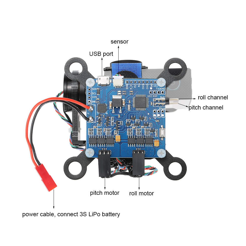 Super light weight 2 axis brushless gimbal, which adopts BGC2.2 controlller panel and made of aluminum alloy. It is specially designed for Gopro 3 and similar size weight camera.