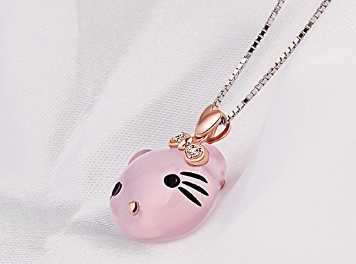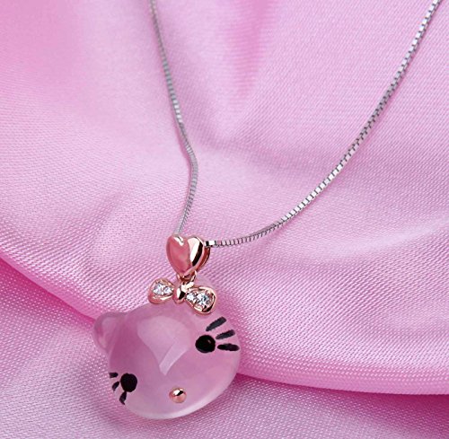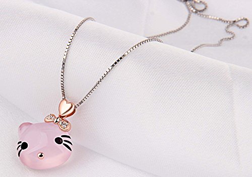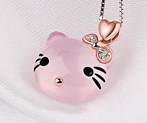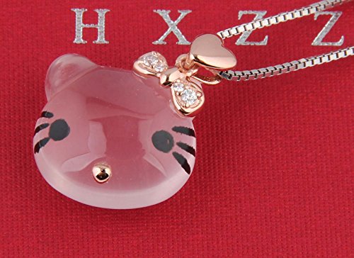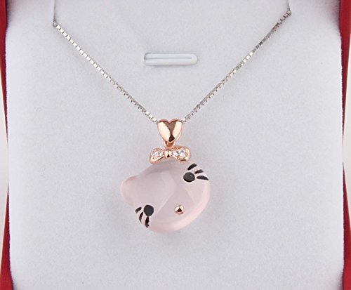 ♥HIGH-QUALITY♥ - the mental of chain: 925 Sterling Silver( 18 k white gold plating surface) Pendant and necklace are affixed with the highest quality sterling sliver "S925". A natural ross quartz is carved into a shape of the head of Hello Kity whose headwear is embellished by some small cubic zirconia. GEM stones ross quartz: high quality. The necklace is 16+2 inch long.