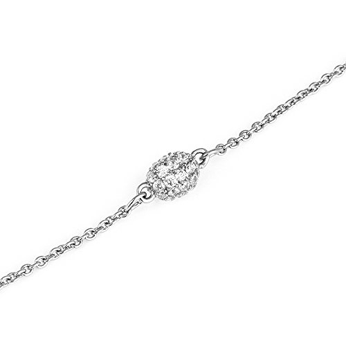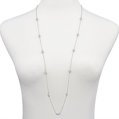 Features 11 oval pavé CZ balls stationed across silver tone long strand chain,