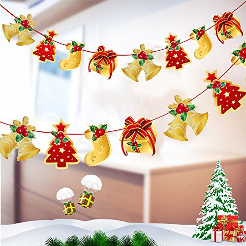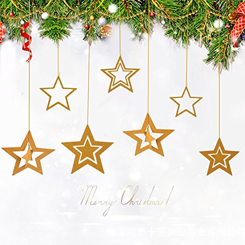 Christmas eve is coming soon, this is a nice choice for your home .Kids will love them, giving your themed party extra atmosphere. Perfect for Xmas party, house,outdoor, pub, business places, kitchen window, door, shop window, trees, window, doorway or on a mantel or wall etc decoration.The spacing can be adjusted and designed. 2 Banners 7 hanging Stars 6 Swirls Rope Length: 3 meters (118inches) Color: Golden Material: Paper Plastic Weight: approx 165g 0.36 Pound Stars size: 3.3-7.7 inches Swirl extended:approx 90cm (35.4in)long Letter size: (13-18)cm*(16-20)cm (5.1-7.3)in*(6.3-7.9)in Color paper size: Reindeer: 18*20cm(7.3*7.9in) Stocking sock:13*16cm(5.1*6.3in) Note: Due to the differences between different monitors and manual measurements, the pictures may not reflect extremely precise color and size of the item. Please allow slight deviation for these information. The golden powder ornament has a slight drop, suggesting a proper shake before use.If you accidentally enter your eyes or mouth, wash it with clean water. Contact your doctor if necessary.
