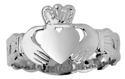 -. Feature : dainty Irish Claddagh ring with Celtic Trinity knot band motif crafted exclusively for women / carefully crafted with fine 14 karat white gold and perfect polished finish / comes with free special gift packaging / made in the USA yet offered at factory direct jewelry P.R.Ice / ships from the manufacturer directly to the customers