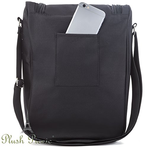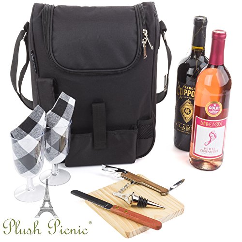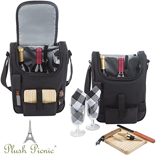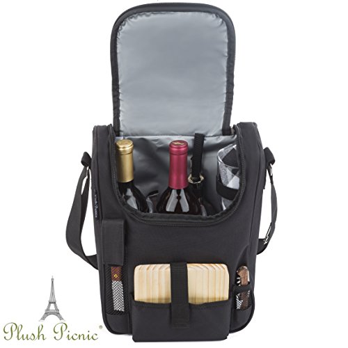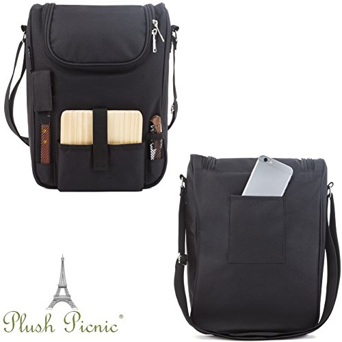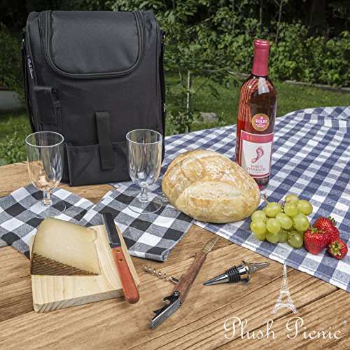 IDEAL CARRYING BAG Easily transport your wine and outdoor picnic items to create the perfect romantic picnic atmosphere. Our shoulder tote with adjustable strap and multiple conveniently sized pockets makes it simple to bring along wine, cheese and more to wow your significant other, friends or family with an elegant picnic experience. INCLUDES REUSABLE ITEMS Full set includes two shatterproof acrylic cups, two washable cloth napkins with black and white gingham pattern, a collapsible corkscrew wooden wine opener, a sophisticated Eiffel Tower wine bottle stopper, a high quality square wooden cheese board and a stainless steel wood handle cheese knife. HOLDS 2 WINE BOTTLES + FOOD Plush Picnic® carry case has space for two regular-sized wine bottles, as well as additional room for cheese, fruit or sushi. This tote has storage space and outside pockets to hold all you need for creating a luxurious picnic setting. Just pick out your favorite wine and cheese, and you're all set for a memorable time at the park or beach. KEEP DRINKS HOT OR COLD Our thick insulated storage tote uses iThermashield® insulation, not thin foam, which is often found in other wine totes. Our high quality tote keeps your wine, drink or food items hot or cold, so you can enjoy a cool glass of wine on a summer day, or keep your soup or beverages warm during chilly winter afternoons. QUALITY MATERIAL Plush Picnic® carrier bag is made of water resistant 600D polycanvas that will not stain, tear or fade. The tote also includes two removable velcro bottle dividers, as well as a 5 year, no-hassle warranty. If you are unsatisfied with your purchase, or something happens to your product, the warranty includes a full replacement. - Dimensions: 10 inches long x 4 inches wide x 13 inches high - Bag Weight: 1.5 pounds - iThermashield® insulation technology - Waterproof polycanvas material with adjustable strap - 5 year no hassle replacement warrantyFeature