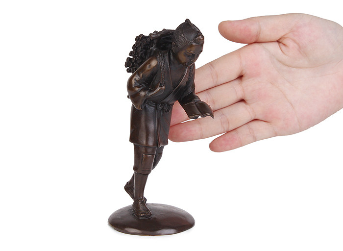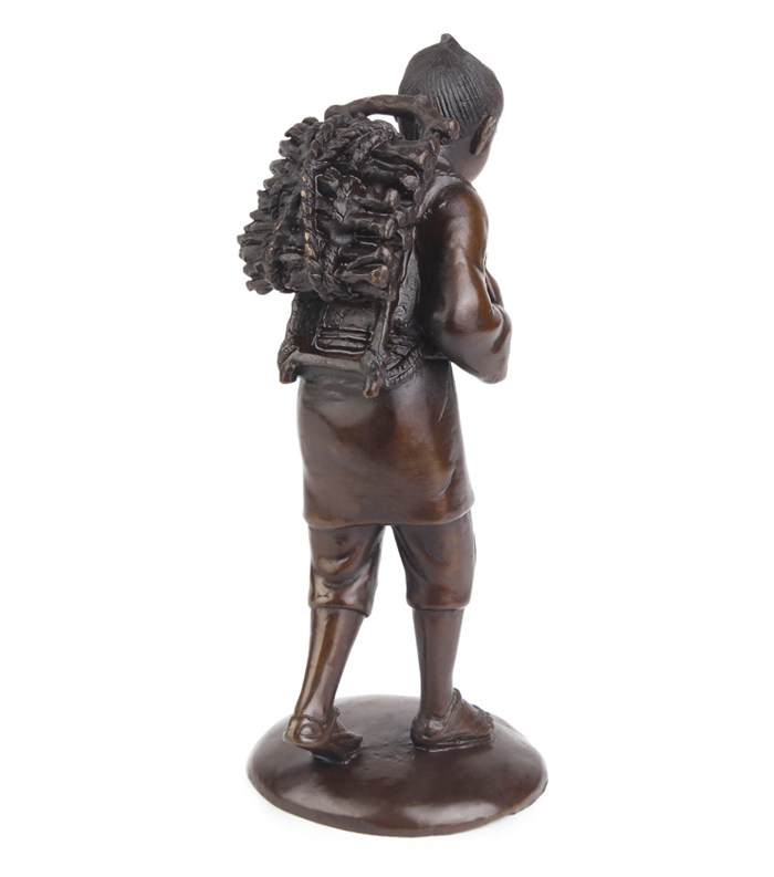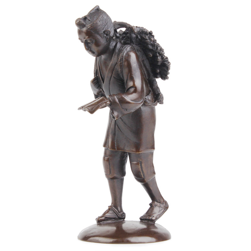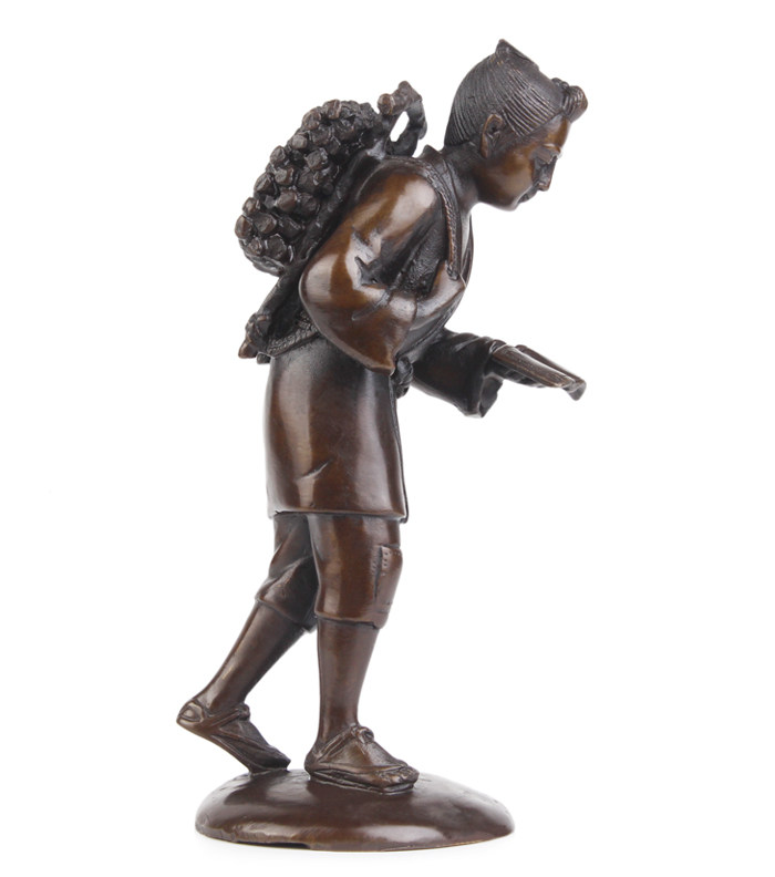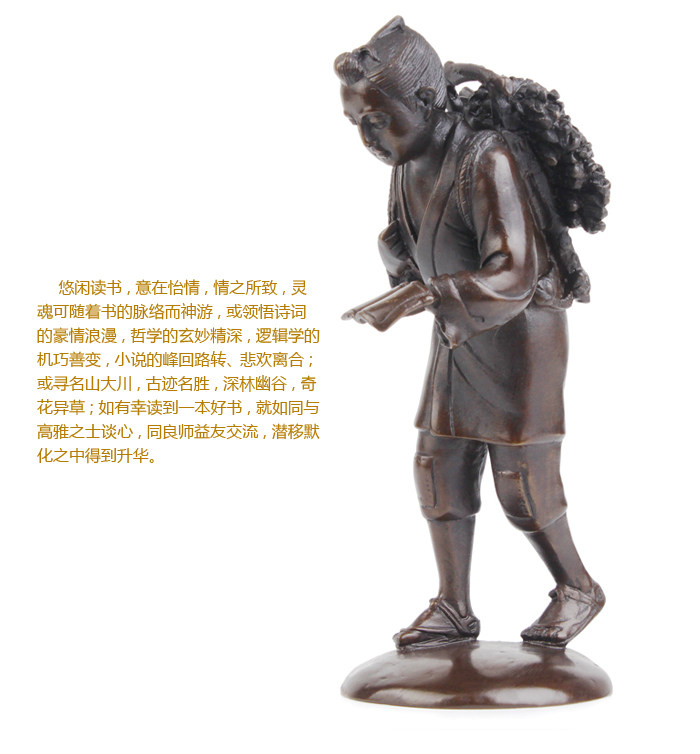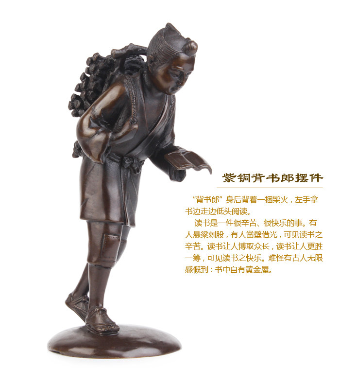 "背书郎"身后背着一捆柴火,左手拿书边走边低头阅读。读书是一件很辛苦、很快乐的事。有人悬梁刺股,有人凿壁借光,可见读书之辛苦。读书让人博取众长,读书让人更胜一筹,可见读书之快乐。难怪有古人无限感慨到:书中自有黄金屋。