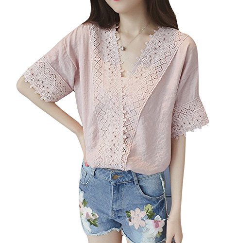 -. Title : formanism 春 夏 ルーズ シフォン 半袖 Vネック かぎ編み レース シャツ レディース (ピンク XL)