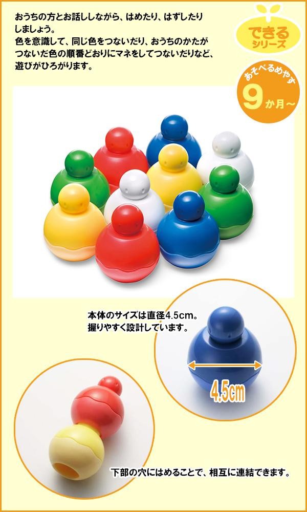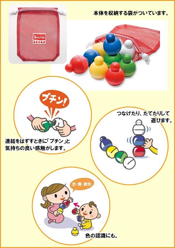はずすときのプチンという感覚と音のおもしろさが、くり返しをうながし集中力と作業力を育てる、赤ちゃんのための「はめる」おもちゃです。しっかり握りやすい大きさと形で、凹凸もわかりやすいので「はじめてのブロック」としてオススメです。 |