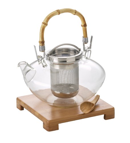 -. Feature : Hand blown borosilicate glass teapot accented with bamboo handle; borosilicate glass resists shock and breakage / Includes micromesh stainless steel filter for loose teas; bamboo tea scoop / Teapot rests on elevated bamboo base included in set / 42-ounce 1 liter capacity / Hand wash recommended