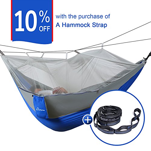 Each box includes one 106-inch by 55-inch hammock with two carabiners, two hang ropes, and two mosquito net ropes.
