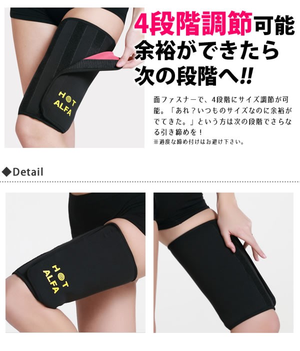 熱を逃しにくい素材で、発汗を促します。巻いているだけで汗じんわ~り・・・肌にあたる部分はジャージ生地を使用しているので肌触りがサラッと快適です。太ももをスッキリ引き締めます。面ファスナーでサイズを4段階に調節できます!