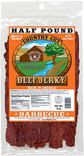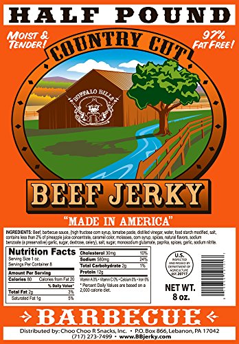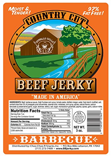 -. Feature : Our Barbecue flavor Buffalo Bills Country Cut Beef Jerky in 2 size packs / Features a "not so secret" Southern twist - molasses and pineapple (a little tangy and sweet) / Easy to chew, thick cut, and extremely moist & tender - made in the USA with 100% US beef / USDA inspected and approved - only 2 carbs and 80 calories per 1oz serving / Our Country Cut Beef Jerky is available in 9 distinct flavors - all are moist and tender