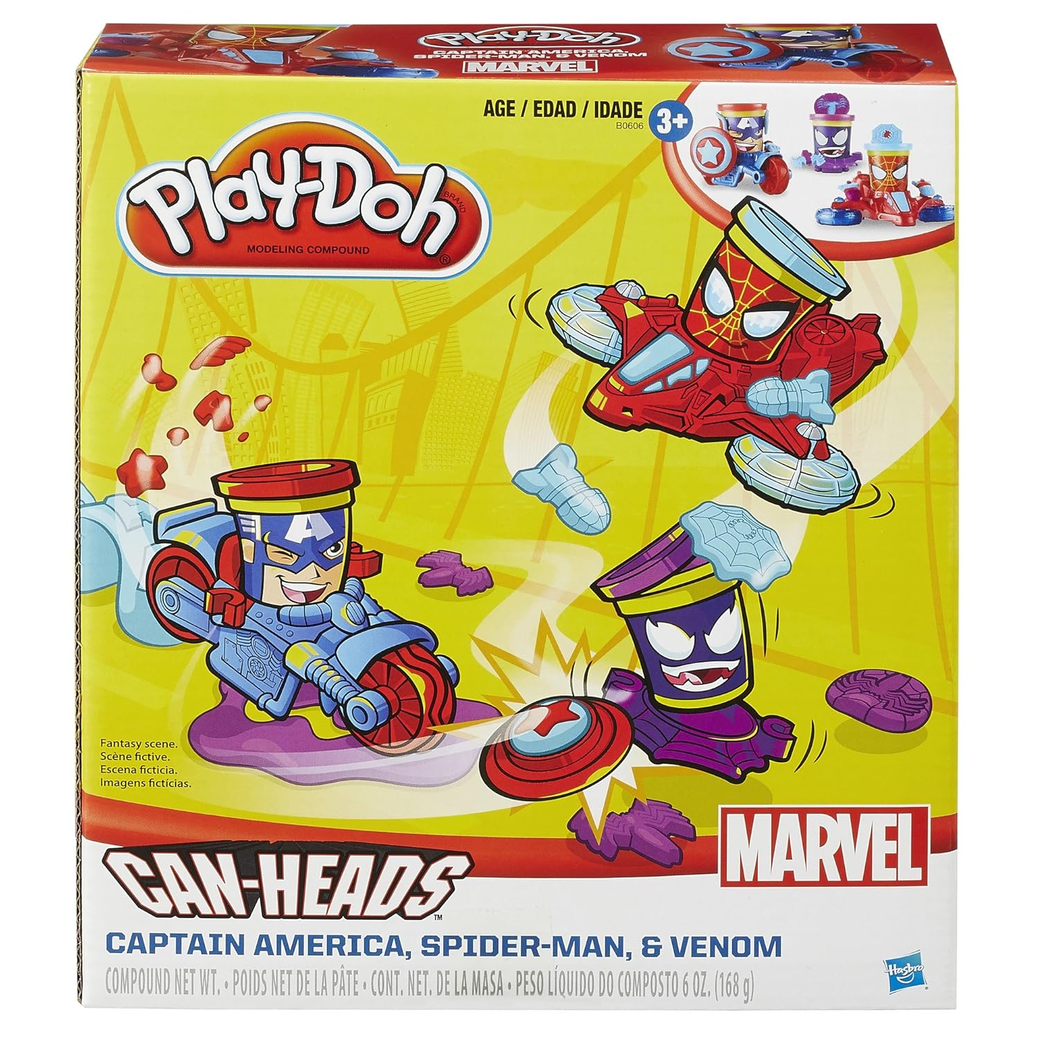 Open the lid of imagination and create your own smash 'n bash adventures with Can-Heads! Now iconic Play-Doh cans are part of the action as you re-create your favorite Marvel Super-Hero battles. Each Can-Heads can contains 2 ounces of Play-Doh compound. Get ready for some can-to-can combat as Spider-Man and Captain America Can-Heads heroes take on Venom in their motorcycle and jet. Amp up the action by using the vehicles to create armour upgrades, missiles, and more! Roll and cut with the wheels on the Captain America motorcycle Stamp and shape with the propellers on the Spider-Man jet Create more shapes with the Venom stamper base