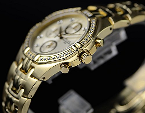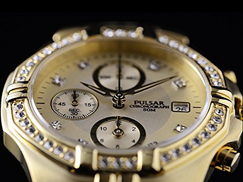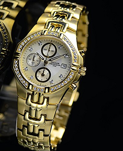 세이코의 구미용 전략 브랜드PULSAR펄사 등장.PULSAR브랜드는 원래는 미국 역대 대통령이 애용했 USA 손에 꼽히는 시계 메이커 해밀턴의 LED워치용 브랜드로서 알려져 있었지만,1979년에 세이코가 브랜드명을 매수하여 현재는 주로 구미용의 전략 브랜드로 해 인기를 얻어 있습니다. 이번품은 진짜 스와로브스키를 호화로 사용한 화려한 크로노그래프.시인성의 높은 샴페인 골드 다이얼과 화려한 골드 바디가 참으로 고저스(gorgeous)인(마무리)결과의 걸작품입니다. (화상으로는 문자판이 빛의 가감에 실버로 보이는 경우가 있지만 현물은 골드입니다) 스펙 적으로는,1/20 초크로노그래프,추진기(screw) 백,50m(5기압)방수,데이트 캘린더등등 충실히 해 있습니다.