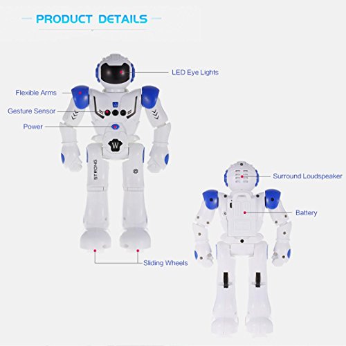 -. Feature : It can slide forward/backward, slide forward/backward, turn left/right. / The robot can sing and dance to entertain you. / The robot can be programmed to carry out movements as you create. / Gesture control: using simple gestures, the robot can react to your gestures with basic movements, along with sound effects. / Best gift for your or friend's kids. A good companion for them.