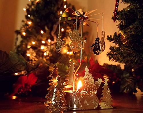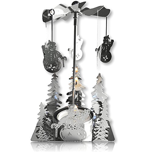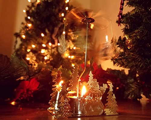 TEALIGHT CANDLE HOLDER. Beautiful silver plated candle holder. Once the tealight (included) is lit, the heat from the candle makes the snowman charms start to move and rotate. These are really pretty Christmas candle holders.