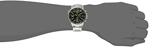 -. Feature : Round solar watch in stainless steel with yellow contrasts on dial, corrugated bezel, and three-link bracelet / Japanese quartz movement with analog display / Protective Hardlex crystal dial window / Features date window, minute and alarm chronograph subdials, stop watch, inner rotating ring, and push-button clasp closure / Water resistant to 330 feet (100 M): suitable for snorkeling, as well as swimming, but not diving