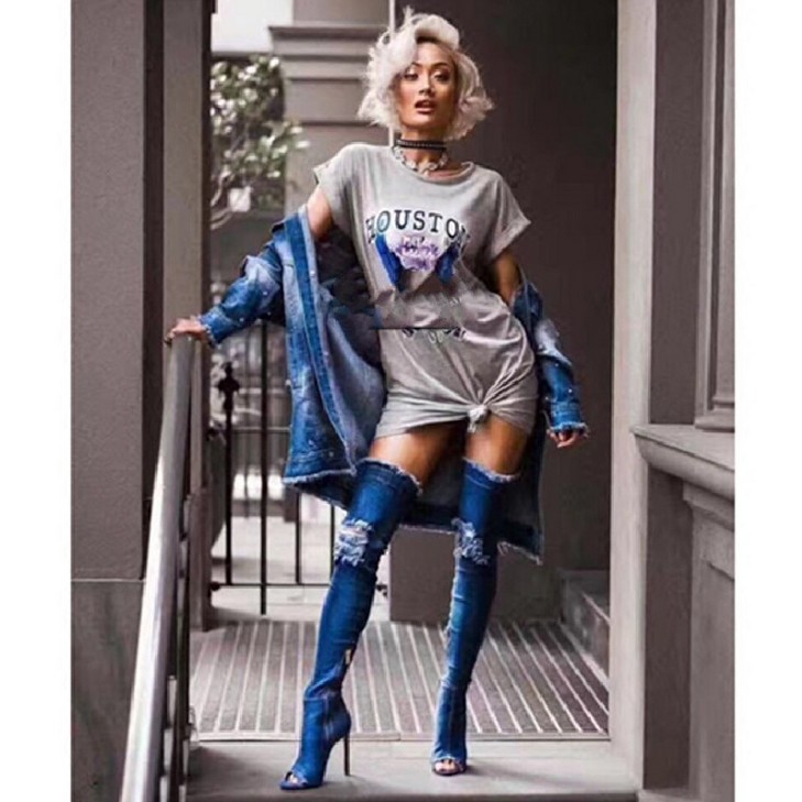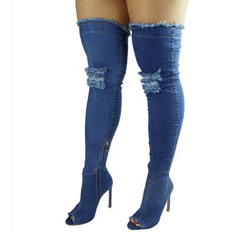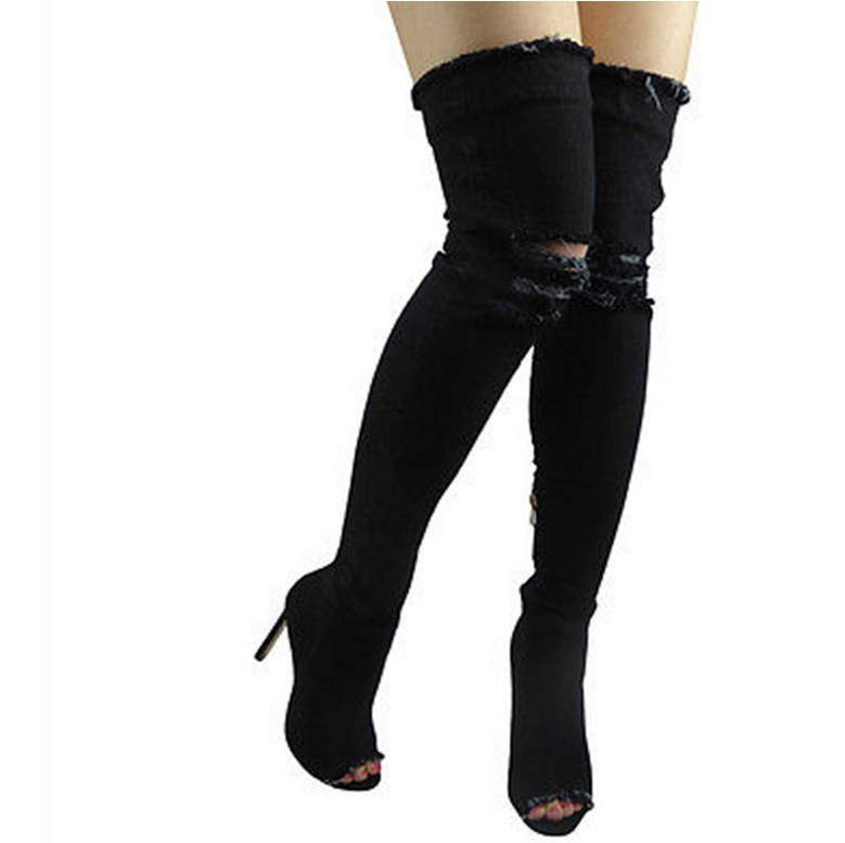 Style 1:Hole Denim High Heels Over The Knee Boots