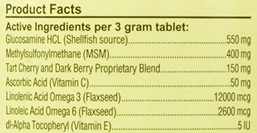 Overby Farm Hip Flex Joint Level 2 Moderate Care with Tart Cherries Formulated to Promote Joint Health and Agility in Active and Aging Canines, Including Large Breeds and Overweight Dogs. Helps Alleviate Aches and Discomfort Associated with Daily Exercise. Tart Cherry Concentrate is a Natural Antioxidant and Helps to Avoid Discomfort by Supporting the Body's Normal Inflammatory Response. Helps Support the Structural Integrity of Joints and Connective Tissues. Chewable, Tasty Tablets, 60ct for Dogs. Recommended to Double the Suggested Daily Amount for the First 3 Weeks. Active Ingredients per 3 Gram Tablet: Glucosamine, Methylsulfonylmethane (MSM), Tart Cherry and Dark Berry Proprietary Blend, Ascorbic Acid (Vitamin C), Linolenic Acid Omega 3, Linolenic Acid Omega 6 and di-Alpha Tocopheryl (Vitamin E). All Overby Farm Products are Veterinarian Formulated and Manufactured in the USA in an FDA Audited, cGMP Compliant Facility with a 100% Satisfaction Guarantee.Feature