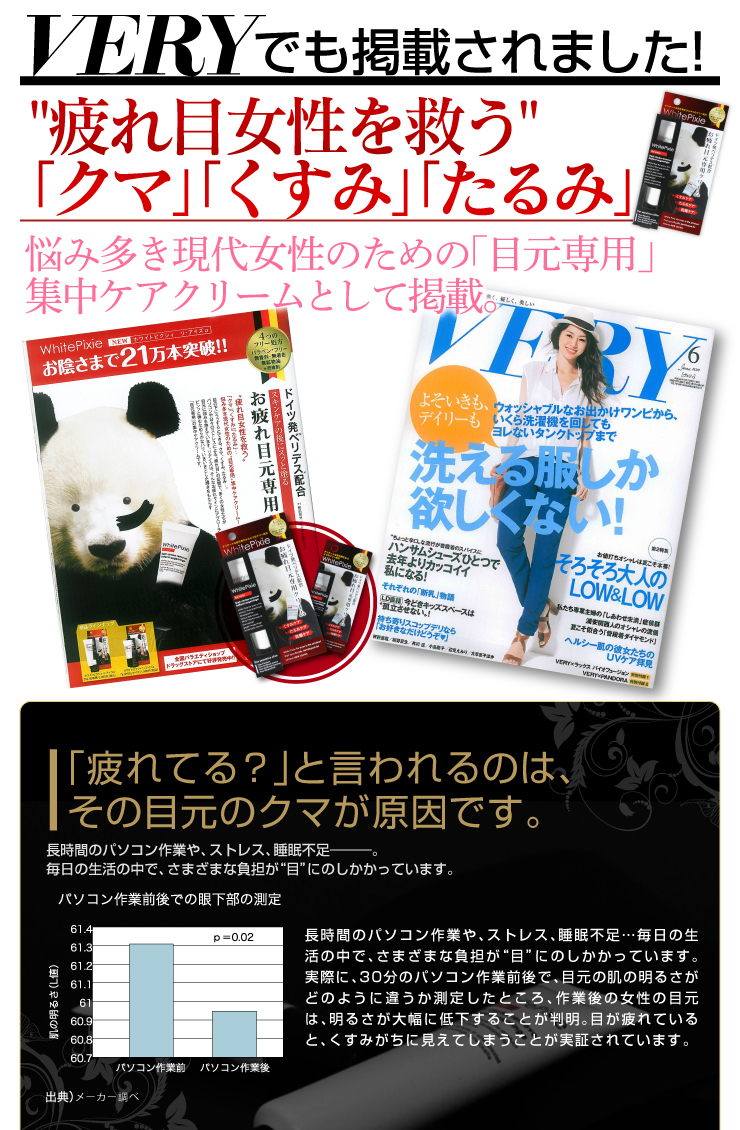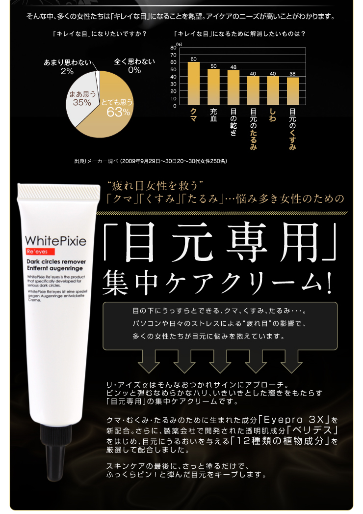 If you have tired eyes..! white pixie intensive care creamClear dark circles under the eyes2 sizes available - 7g and 25gRakuten Ranking No.1 ProductTremendous satisfaction from the customers..They have got perfect results from the 1st time according to the customer survey