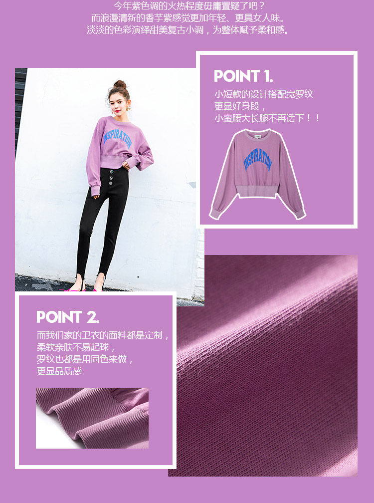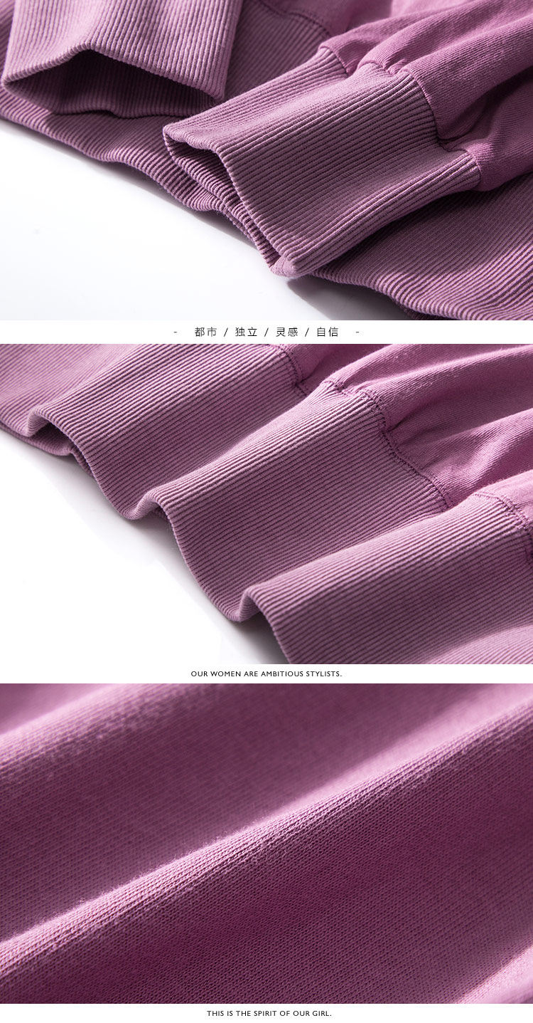 | 面 料:主布:棉 罗纹:97.9%棉 2.1%氨纶颜 色:紫色 |