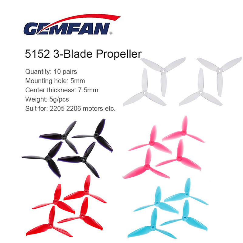 This original GEMFAN 5152 propeller set includes 5 colors: transparent, blue, red, black and pink. They are suitable for 2204 2205 2206 motors.