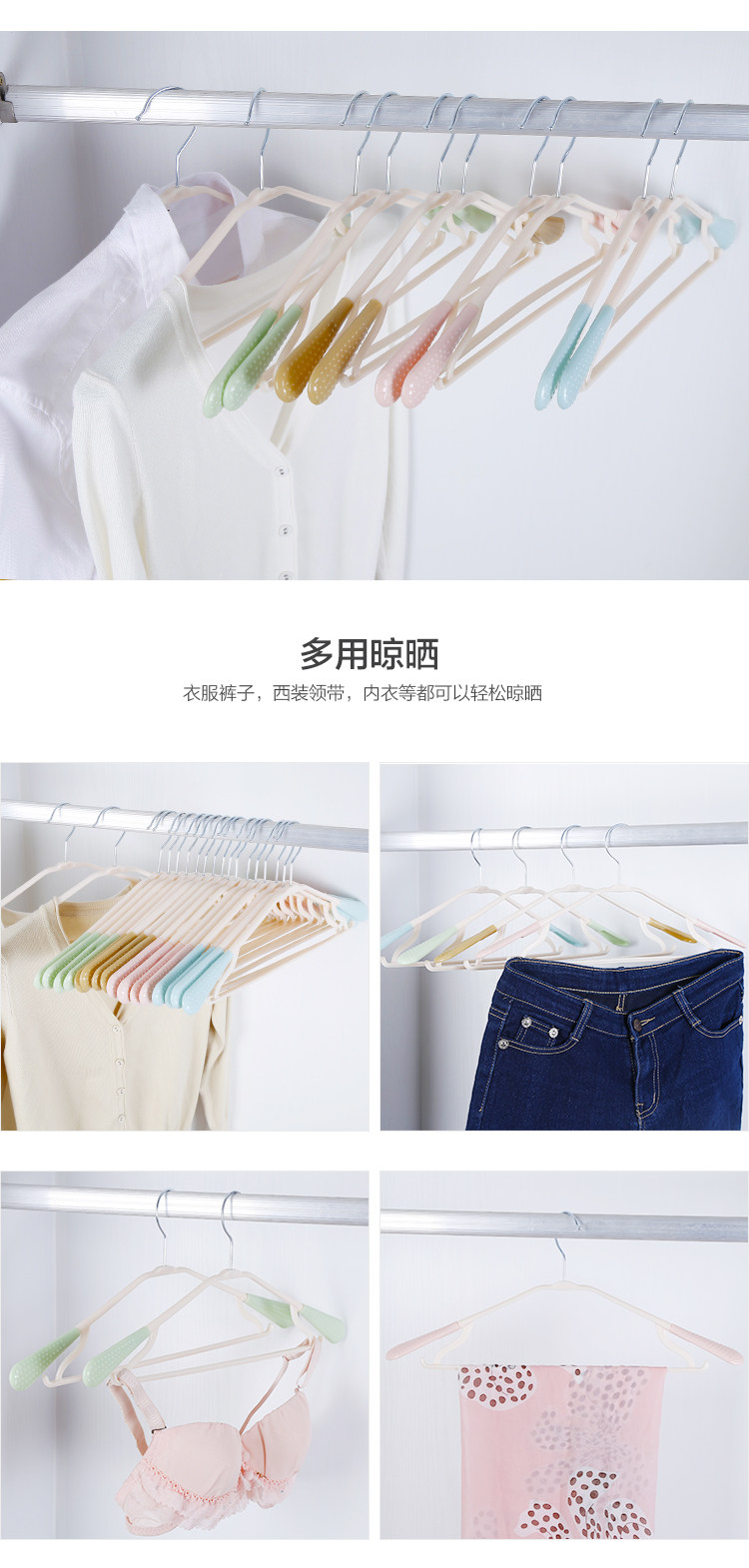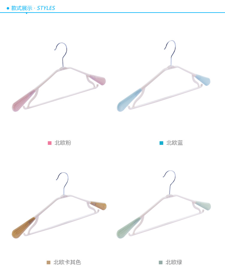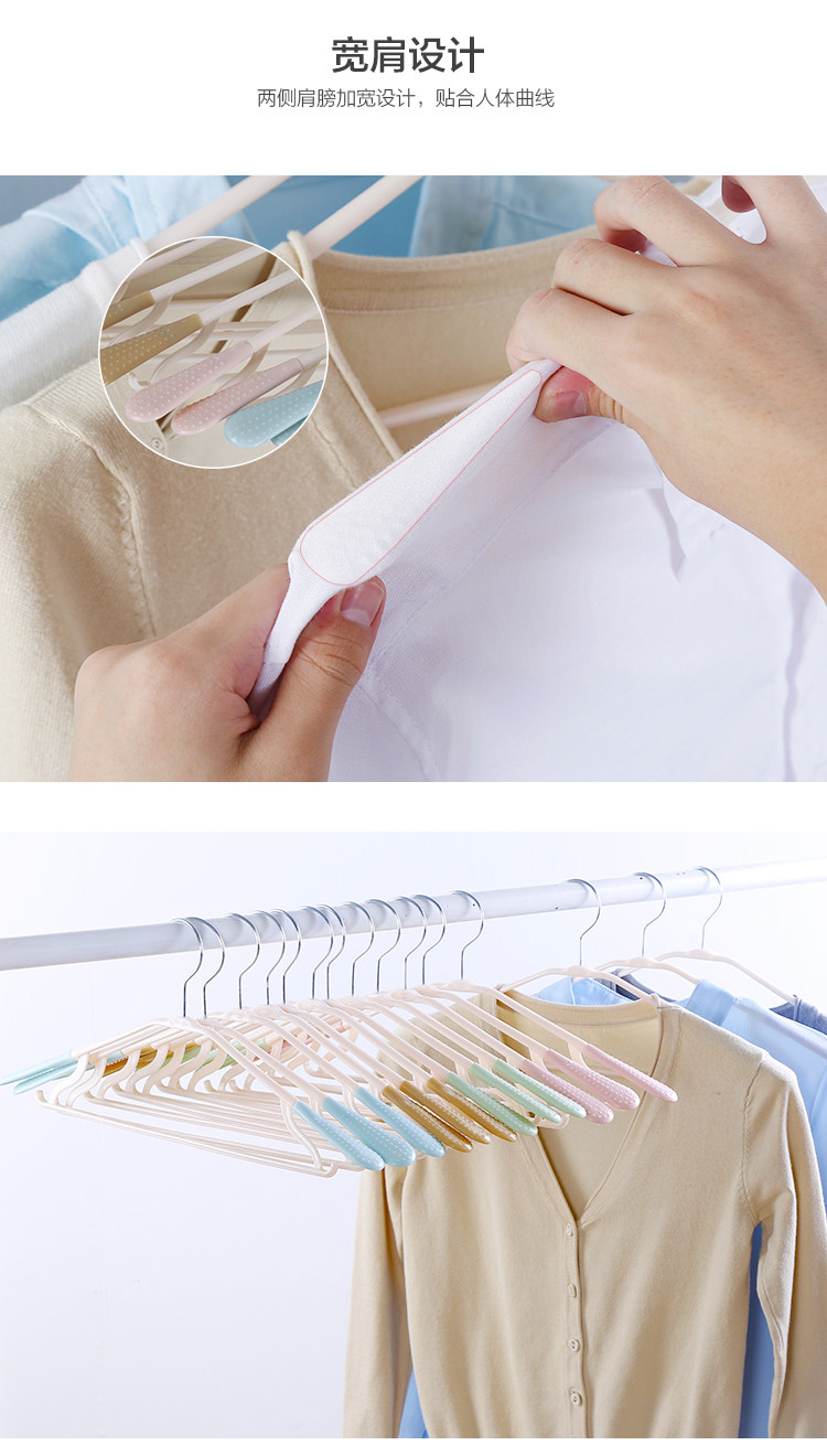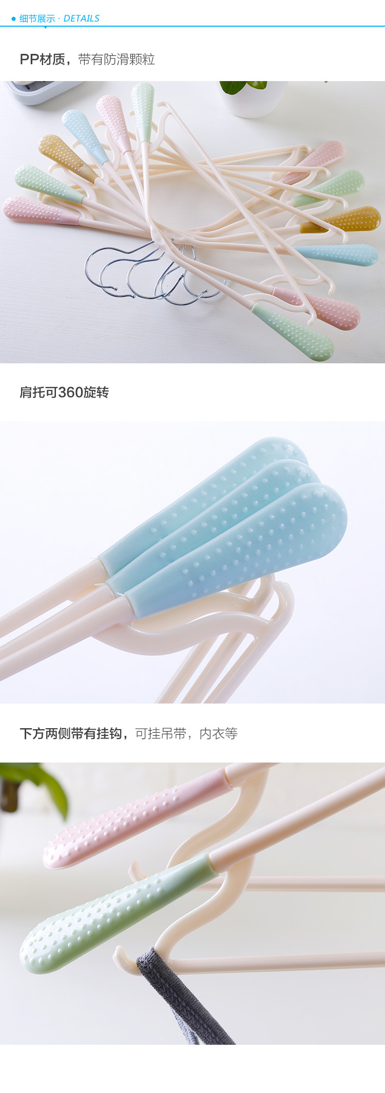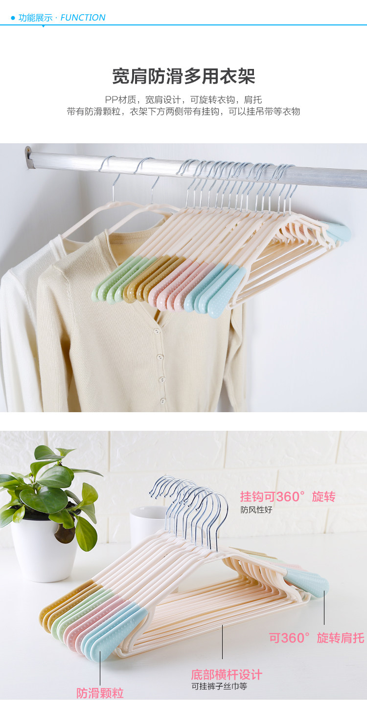 PP材质,宽肩设计,可旋转衣钩,肩托,带有防滑颗粒,衣架下方两侧带有挂钩,可以挂吊带等衣物,干湿两用