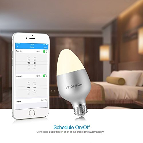 - [Turn Lights on or off Automatically According to Timers] You can set different timers to turn on or off Koogeek smart light bulbs. Wake up in the morning with your favorite light turned on automatically. No need to worry about leaving home and forgetting to turn off lights.