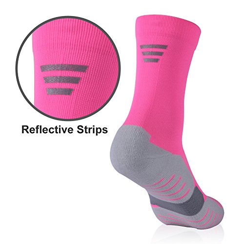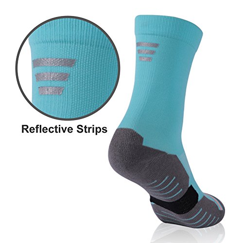 -. Feature : REFLECTIVE STRIPS DESIGN: Reflective strips with high visibility on the instep can reflect the surrounding light so as to warn both pedestrians and drivers, thus affording easy recognition and making it safer to walk, run or cycle outside in the dark / SOFT CUSHION: The extra padding on the bottom of the socks provides light shock absorption and vibration reduction, which allows a long-lasting comfort throughout the entire walking or workout in the high impact areas of your heel and toe. The Crew Socks are ideal for outdoor activities and sports such as Walking, Running, Hiking, Trekking, Trail Running, Cycling, Basketball, Volleyball, etc / ELASTIC ARCH SUPPORT: Elastic arch compression adds support and stability to reduce foot fatigue. Fine gauge knitting provides breathable, anti-bacterial and fast drying properties to the Hiking/ Running Socks, making it super comfortable to wear / HAND STITCHED SEAMLESS TOE: Seamless toe stitching reduces abrasion and provides extra protection against blistering. Elasticated cuffs prevent the socks from sliding down during movement. Facool Athletic Socks are easy to pair with all kinds of sports shoes like running shoes or tennis shoes / MOISTURE WICKING: Breathable mesh zone design coupled with the lightweight synthetic blend fabric increases ventilation to control moisture, thus keeping your feet cool and dry during sports and exercise