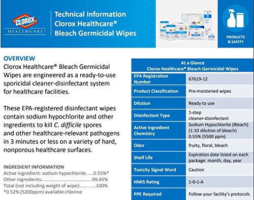 -. Feature : Clorox healthcare bleach germicidal Wipes and Spray can be used almost anywhere to clean and disinfect hard, nonporous hospital surfaces / Fastest: EPA-registered to kill C, difficile spores in 3 minutes / Proven: reduces the transmission of C, difficile spores, supported by clinical studies / Recommendeduces the transmission of C, difficile spores, supported by clinical studiesed: Meets CDC, Shea and APIC recommendations for killing C, difficile spores / Also indludes one box of 100 Medical Grade Large Nitrile Gloves