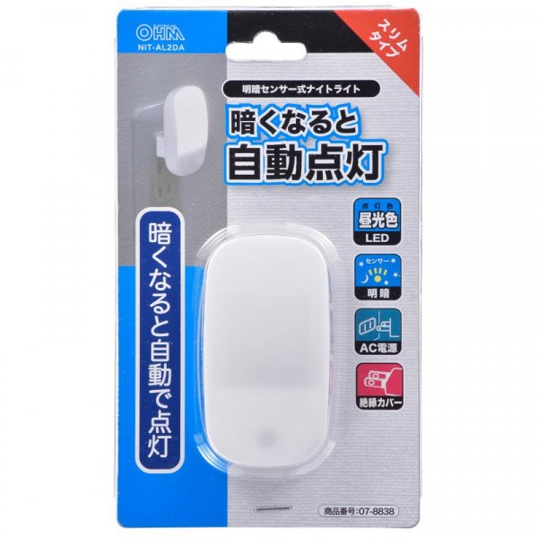| 暗くなると点灯、明るくなると自動消灯します。絶縁カバー付プラグでトラッキング火災を予防します。 |