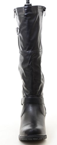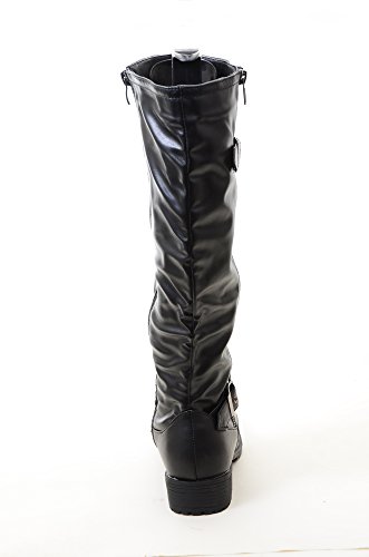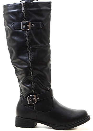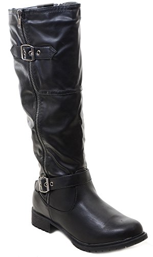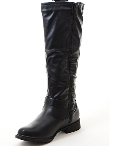 Binding : Apparel Product Description Stay fashionable during the new season in these stylish Knee-high boots. Featuring round toe front, faux leather upper, three straps with adjustable buckle closure, stitching detail, low flat heel, and side zipper closure for easy on and off dressing. 0