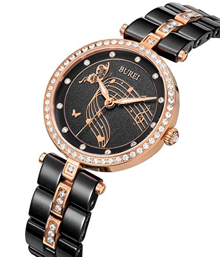 -. Title : BUREI® Women's "Elegant" Swarovski Crystal-Accented Black Ceramic and Rose Gold-Tone Watch