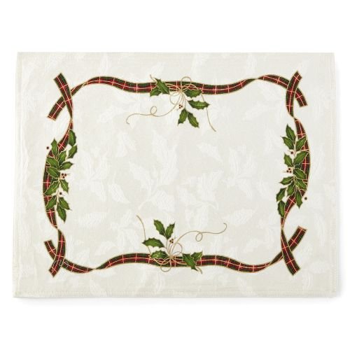 Amazon.com Review The combination of jacquard damask fabric and classically colored accents make the Lenox Holiday Nouveau linen line a sophisticated way to dress the table for holiday festivities. Fashioned from a cotton-polyester blend, the line has a subtle sheen to its background, which features an ivory field set with tone-on-tone holly leaf patterns. Flowing tartan bands, strands of gold ribbon, and clusters of bright green holly with red berries add merriment and color to the look. The line is a beautiful accent to plain or gold-banded china and goes well with several of Lenox's holiday dinnerware patterns. Available in placemats, napkins, runners, and tablecloths of numerous shapes and sizes, Holiday Nouveau linens are machine-washable and safe in the dryer. --Emily Bedard 0