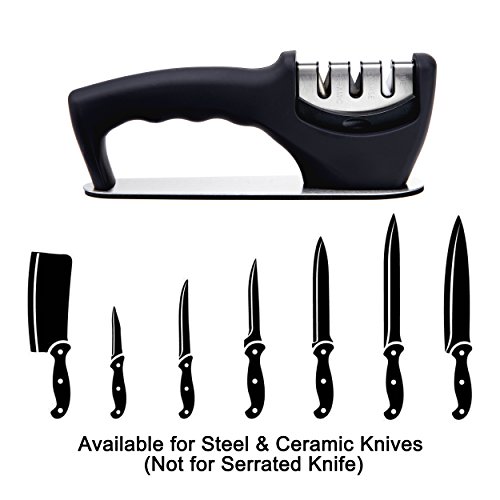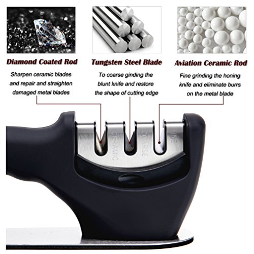 3 STAGE SHARPENING SYSTEM: Design with innovative 3 different sharpening slot(tungsten steel/ceramic rod/diamond rod)which provide seamless and efficient sharpening system, follow the instruction you can sharpening the blunt knifes honing knives ceramic knives with the right slot.