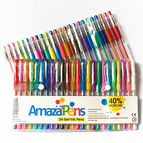 AmazaPens Gel Coloring Pens. Assorted 24 Pack, 40% More Ink Than Other Sets! Glitter, Neon & Pastel. Superior Quality Colored Pen. Best Gift for any Adult or Child Who Loves to Draw, Write or Color.