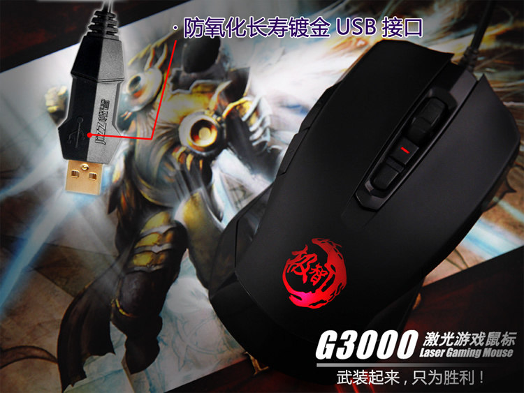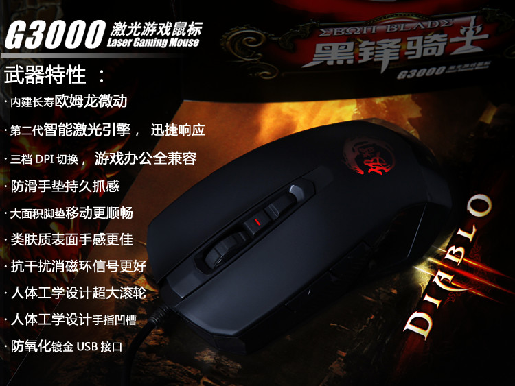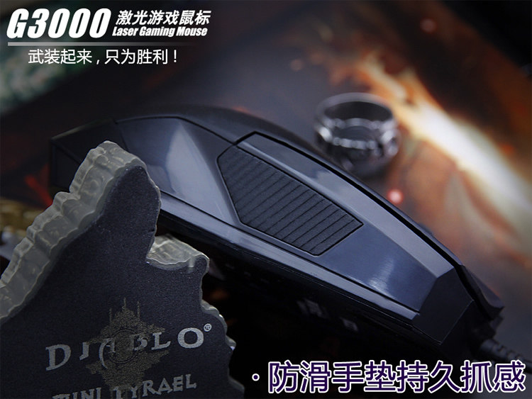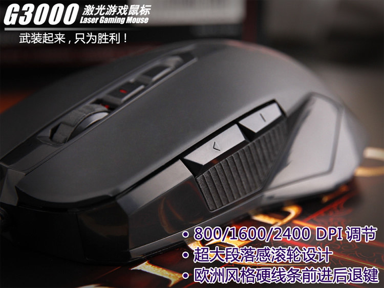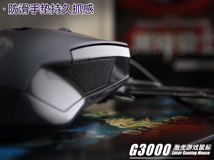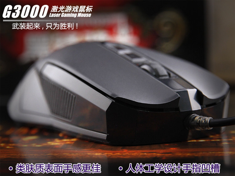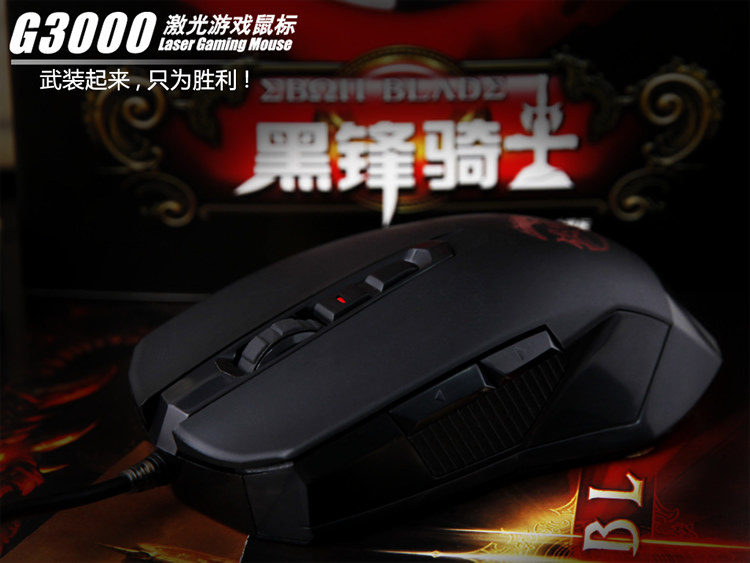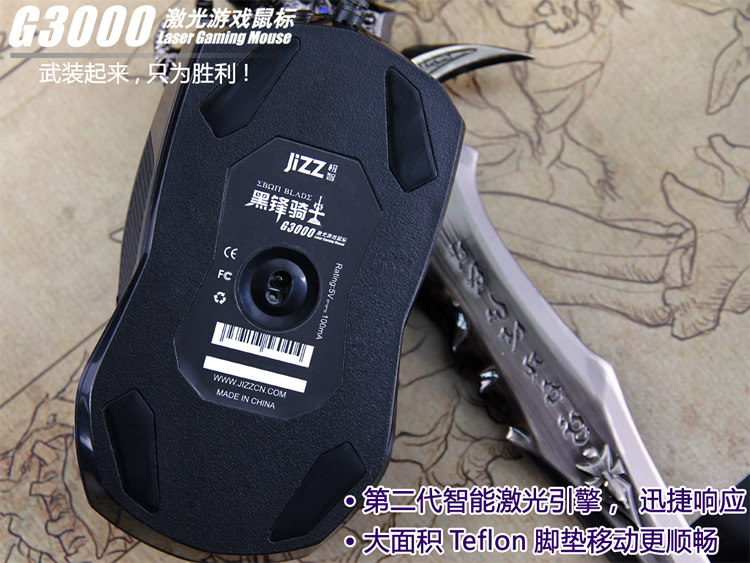极智黑锋骑士G3000游戏鼠标采用安捷伦推出的A7700激光引擎,并配有红色LED灯,采用了优质的屏蔽防干扰导线,以确保纯净的数据传输。极智黑锋骑士G3000游戏鼠标的底部设有超大面积特氟龙脚垫,以确保鼠标移动更加稳定。最后让我们来看看极智黑锋骑士G3000游戏鼠标在游戏中的表现如何
