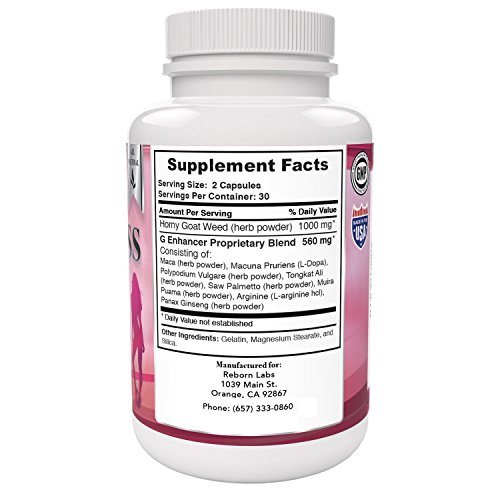 -. Binding : Health and Beauty -. Brand : Reborn Labs -. Color : Pink, Black -. EAN : 0643451296518 -. Feature : MORE PLEASURE - OR YOUR MONEY BACK! You want to feel satisfied, don't you? But sometimes because of stress or hormones, libido can take a big drop. This can cause unwanted frustration and stress. Luckily, this female libido booster is here to help - we have developed a complete libido booster for women, formulated to help enhance pleasure, libido, desire, and stamina. No need to worry any longer - just relax and enjoy the ride! / FEEL AROUSED QUICKER. By boosting key female hormones and improving blood flow to you-know-where, this female libido booster can help you feel aroused and ready faster than usual. In addition, you can feel more sensitivity for increased pleasure. Just make sure your man is ready too! / 100% "WILD & SATISFIED" GUARANTEED. If you're not as 'Wild & Satisfied"' as you'd like (unlikely, but possible), we'll give you a full refund. What are you waiting for? Get your bottle of Goddess and see what it can do for you! Just click the ADD TO CART button before we run out! / UNLEASH THE GODDESS WITHIN! Face it - you know you have a "wild side". Don't you want to feel desired and loved like a true Goddess? This natural libido supplement can support your libido so that YOU take the first step. Imagine the look on your significant other's face when it's YOU taking charge. Don't you think that'll spice things up a bit? / PREMIUM ENHANCEMENT BLEND JUST FOR WOMEN. We formulated this libido enhancer with the smart, savvy woman in mind. You already know 1 ingredient is not enough to see benefits. That's why we developed a complete blend with ingredients such as Horny Goat Weed, Maca, Mucuna Pruriens, Tongkat Ali, and Panax Ginseng. These ingredients are scientifically proven to improve desire, performance, and libido for women. -. IsAdultProduct : 0 -. Label : PL Supplements -. LegalDisclaimer : These statements have not been evaluated by the Food and Drug Administration. This product is not intended to prevent, cure, or treat any disease. Please consult with your medical professional before using this product. -. Manufacturer : PL Supplements -. MPN : Limited Edition -. PackageQuantity : 1 -. PartNumber : Limited Edition -. ProductGroup : Health and Beauty -. ProductTypeName : HEALTH_PERSONAL_CARE -. Publisher : PL Supplements -. Studio : PL Supplements -. Title : Female Libido Enhancer Supplement | Fast-Acting Enhancement for Women | Increases Pleasure, Stamina & Libido for Women | Premium Natural Libido Booster for Women with Herbal Ingredients | 60 Capsules -. UPC : 643451296518