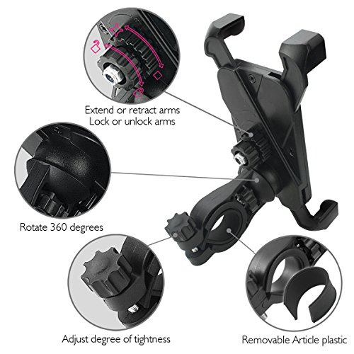FLEXIBLE DESIGN : Adjustable 360 degree rotatable Bicycle Phone Mount firmly accommodates various phones and GPS devices(iphone 6/6s/5s/5c/5,Samsung Galaxy S5/S4/S3, Google Nexus 5/4, LG, HTC etc.)