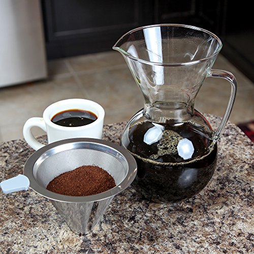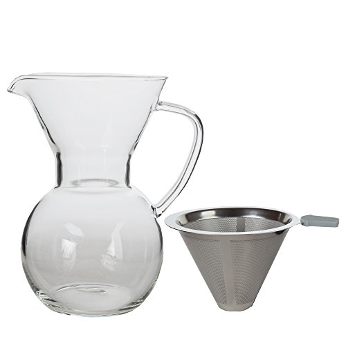 Studio : Home-X Publisher : Home-X Product Description Great-tasting cup of coffee with no paper filter brewing! This laser cut steel filter allows the brew to retain the delicious flavors and oils which paper filters steal away. Serve the finest coffee in this stylish glass carafe. Makes an elegant setting on any table. INSTRUCTIONS: Simply place the stainless steel coffee dripper on top of the glass carafe and add 2 tablespoons of freshly ground coffee into the filter for each 6 ounces cup of coffee you are making (use more coffee if you prefer it stronger). Then pour 1 ounce of boiling water over the fresh grounds. Wait a few seconds for grounds to expand and then slowly add the rest of the water, pouring in a circular motion. You'll have fresh, tasty coffee ready to sip in no time! CLEANING: Stainless Steel Filter: Hand wash with warm soap and water. Coffee Pot: Hand wash with warm soap and water, or place the coffeemaker securely in the dishwasher. Available in two sizes: 3-Cup Carafe - Holds 17 fluid oz. and measures about 7" x 5". 5-Cup Carafe - Holds 34 fluid oz. and measures about 9" x 6". 0