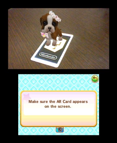 -. Binding : Video Game -. Brand : Ubisoft -. EAN : 0008888166948 -. Edition : Standard -. ESRBAgeRating : Everyone -. Feature : Adopt and take care of more than 10 breeds of dogs and choose from the most popular breeds. / Exercise your dogs via agility & jumping courses. / Interact with your virtual dogs as if they're real pets. / Augmented reality lets your puppies practically live in YOUR environment - Take a photo of your environment and then let your puppies play in that same environment in the game. / Via StreetPass, visit with other puppies, and exchange pictures, gifts and letters. -. Genre : artificial_life_simulation_games -. HardwarePlatform : Nintendo DS -. IsAutographed : 0 -. IsEligibleForTradeIn : 1 -. IsMemorabilia : 0 -. Label : UBI Soft -. Manufacturer : UBI Soft -. Model : 16694 -. MPN : 16694 -. NumberOfDiscs : 1 -. NumberOfItems : 1 -. OperatingSystem : Nintendo DS -. PackageQuantity : 1 -. PartNumber : 16694 -. Platform : Nintendo 3DS -. ProductGroup : Video Games -. ProductTypeName : CONSOLE_VIDEO_GAMES -. PublicationDate : 2011-11-08 -. Publisher : UBI Soft -. ReleaseDate : 2011-11-08 -. SKU : UB 16694 -. Studio : UBI Soft -. Title : Puppies 3D -. UPC : 008888166948