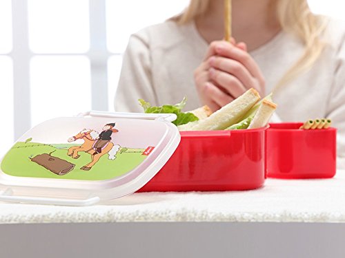 Fest verschliessbar dank 2 stabiler Bugelverschlusse links und rechts, Praktische Abtrennung von Brot und Obst/Gemuse durch herausnehmbare Rohkost-Schale