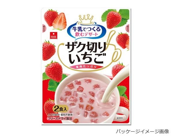 | 牛乳でつくるフルーツの果肉を味わうデザート。冷たい牛乳を注いでかき混ぜたら、ザク切りのいちご果肉がたっぷり入ったいちごミルクの出来上がり。フリーズドライ製法で、いちごのおいしさをそのまま閉じ込めました。人工甘味料・香料・着色料を使用せず、いちごの自然な風味を生かしました。グラノーラやヨーグルトとも美味しくお召し上がりいただけます。 |
