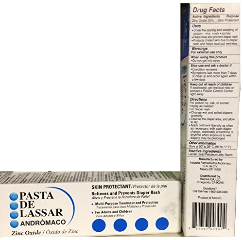 -. Binding : Health and Beauty -. Brand : ANDROMACO -. EAN : 4893603118830 -. Feature : PASTA DE LASSAR ANDROMACO 2.1 OZ Skin Protectant, multi-purpose treatment and protection for adults and children / Relieves and prevents diaper rash. Paste to protect skin / PASTA DE LASSAR ANDROMACO, Skin Protectant, multi-purpose treatment / Pasta de lassar proteje la piel -. IsAdultProduct : 0 -. Label : ANDROMACO -. Manufacturer : ANDROMACO -. MPN : 114 -. PackageQuantity : 2 -. PartNumber : 114 -. ProductGroup : Health and Beauty -. ProductTypeName : HEALTH_PERSONAL_CARE -. Publisher : ANDROMACO -. Studio : ANDROMACO -. Title : Pasta De Lassar Andromaco 2.1 Oz (Pack of 2)