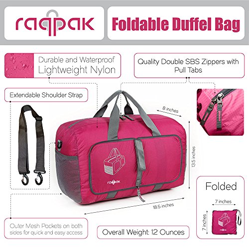 -. Brand : Raqpak -. Department : unisex-adult (lage only) -. Feature : Quality and Uniquely Designed Foldable Travel and/or Gym Duffel Bag / Small enough to use as a Carry On Lage but large enough to hold multiple everyday garments and essentials / Suitable for Women, Men, Teens and big Kids / Made with durable lightweight waterproof Nylon / No Questions asked, Money Back Guarantee if you aren't 100% happy with your purchase -. ProductGroup : Apparel -. ProductTypeName : LAGE -. Title : Raqpak Travel Duffel Bag Foldable for Gym or Lage, Multiple Colors