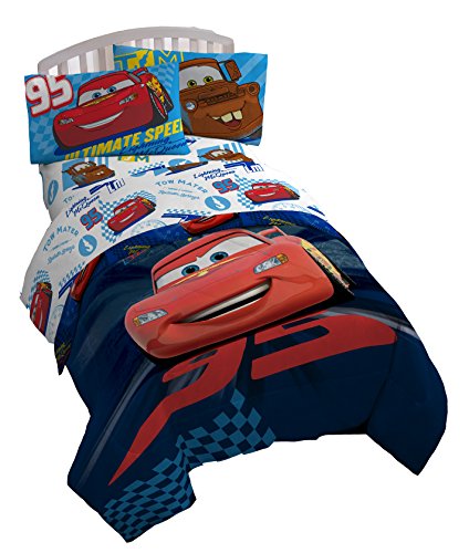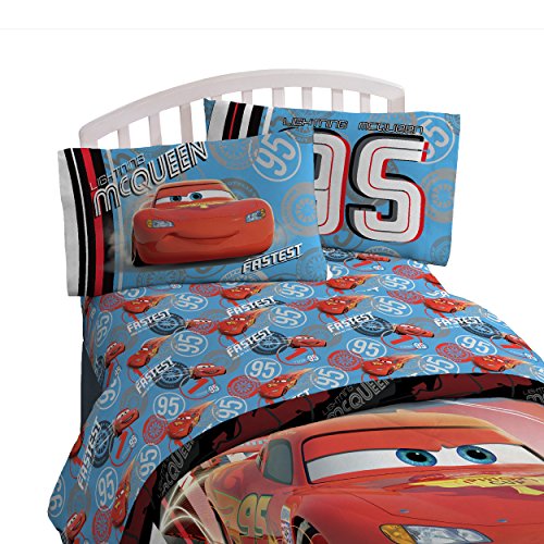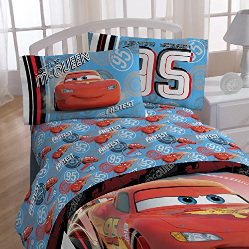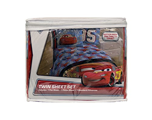 Transform any child's bedroom with a Disney Cars super soft microfiber sheet set. This super fun bedding sheet set will make any child smile. Each 3 piece, super soft microfiber twin sheet set includes a fitted sheet, flat sheet and one standard reversible pillowcases. The bold colors and exciting design will enhance the existing decor of any kid's or toddler bedroom. Fitted sheet measures 39" x 75", flat sheet measures 66" x 96" with one 20" x 30" standard pillowcases. Decorative bedding features popular characters and icons from the movie. 100% polyester. Easy care, machine wash cold, tumble dry low. ImportedFeature