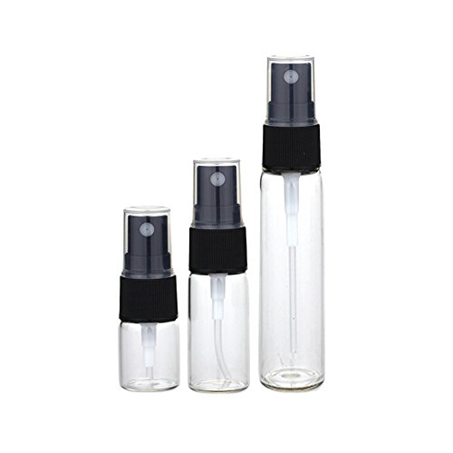 - Set of 10: Clear Glass Bottles, with Black Fine Mist Sprayers,and Transparent Dust caps.