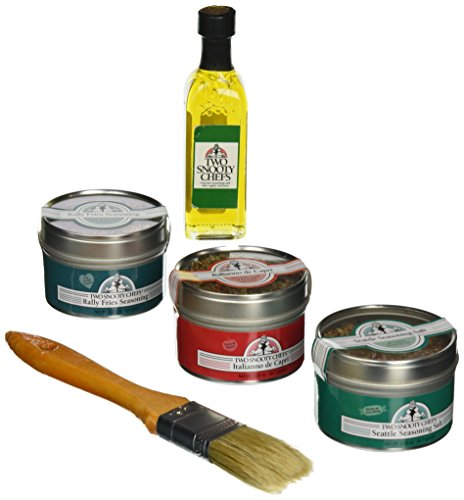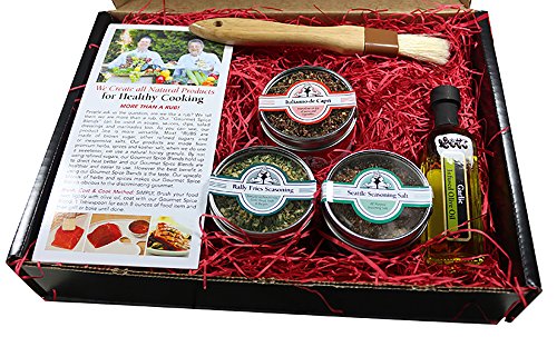 -. Feature : Brush the food item with our garlic infused oil olive / Coat with our seasoning, then grill or bake / The gift box comes with the Italianno de CaP.R.I, rally fries seasoning / Seattle seasonings salt gourmet spice blends / 1 deluxe pastry brush and a glass bottle of garlic infused olive oil