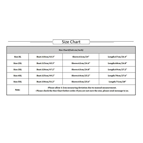 What you get:1*Women Blouse Size Chart(Unit:cm/inch) Size:XL Bust:110cm/43.3" Sleeve:61cm/24" Length:67cm/26.4" Size:2XL Bust:115cm/45.3" Sleeve:62cm/24.4" Length:68cm/26.8" Size:3XL Bust:120cm/47.2" Sleeve:63cm/24.8" Length:69cm/27.2" Size:4XL Bust:125cm/49.2" Sleeve:64cm/25.2" Length:70cm/27.6" Size:5XL Bust:130cm/51.2" Sleeve:65cm/25.6" Length:71cm/28" Note: -Please allow 1-2cm measuring deviation due to manual measurement. - Please check the Size Chart before order. If you are not sure the size, please send message to us. 0